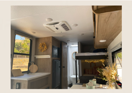 **Luxury Amenities:** With a full bath, electric fireplace, and air conditioning, every moment in the Leap Pad is a pampered experience. Whether you're chasing adventure or simply unwinding, you'll feel right at home.